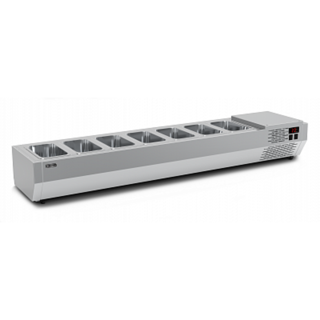 Витрина для ингредиентов Carboma A30 SM 1,6 (7 GN1/4) предназначена для охлаждения, кратковременного хранения и наглядной демонстрации ингредиентов и готовых блюд — салатов, пиццы, закусок и т.п. Отлично подходит для установки на холодильные и пицца-столы, барные стойки, прилавки и другие поверхности. Рекомендуется для кафе, ресторанов, баров, супермаркетов и объектов быстрого питания.