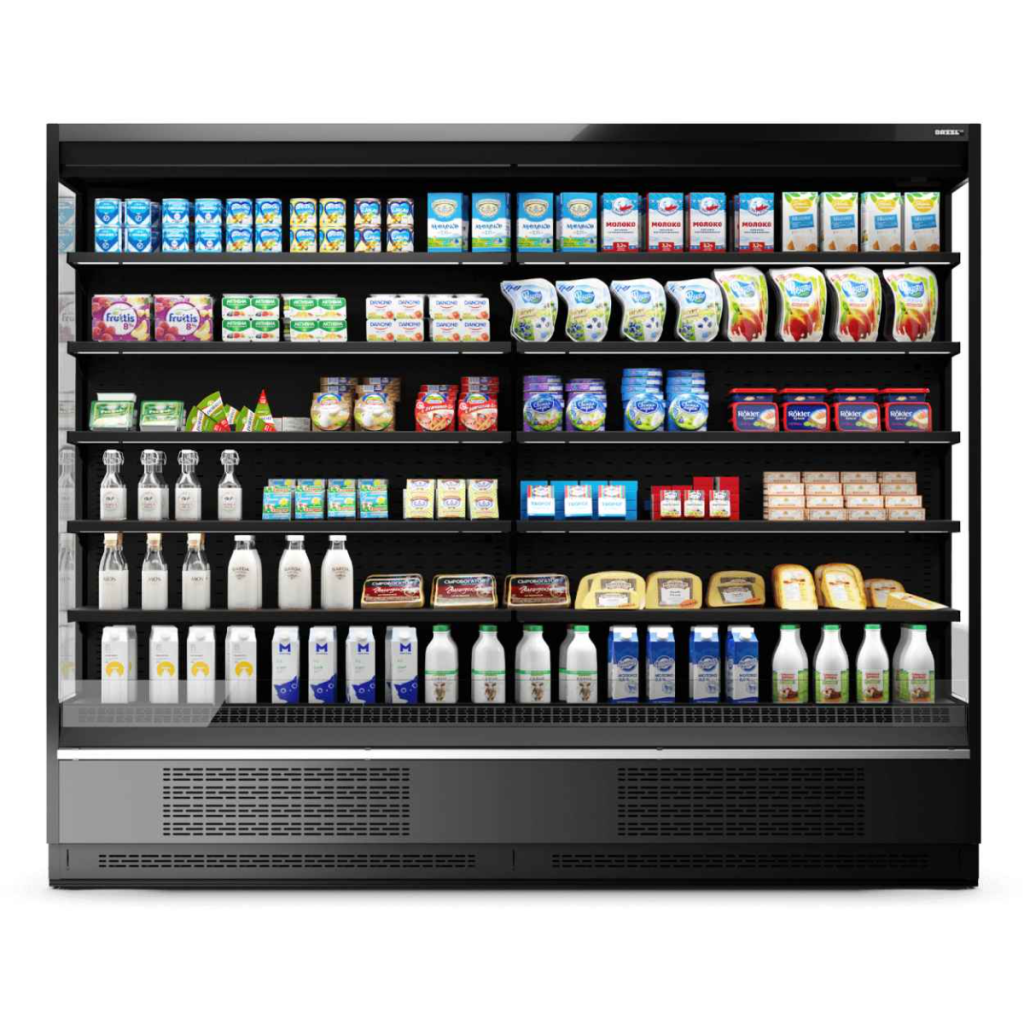 Открытая конструкция обеспечивает максимальную доступность товаров для покупателей и удобство при обслуживании. Данная модель оборудована подставкой с встроенным холодильным агрегатом, воздухоподводящими решётками и навесными экспозиционными полками с наклонными профилями ценникодержателей.