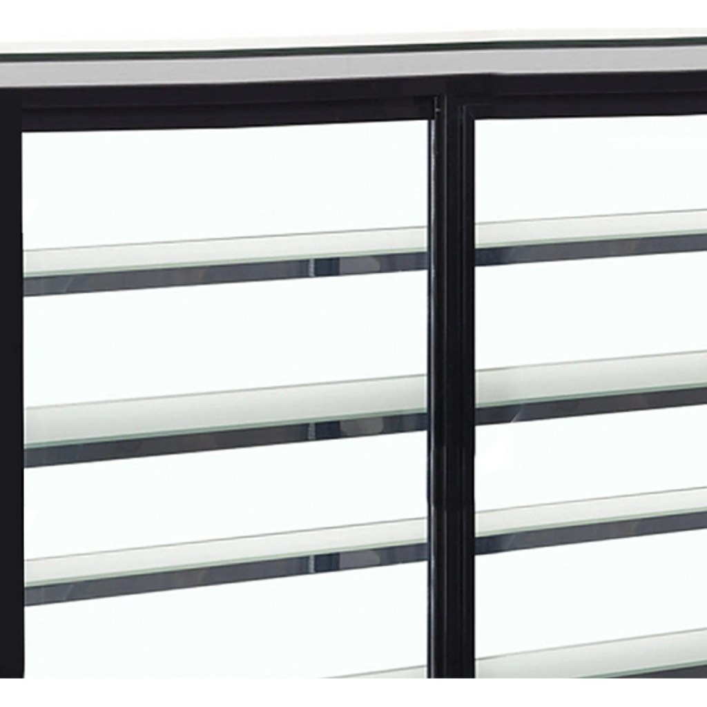 Витрина оснащена двумя раздвижными дверцами со стороны продавца, дополнительным полочным пространством и светодиодной подсветкой каждой полки, что делает продукты максимально заметными. Купол выполнен из нержавеющей стали и прямого стекла, а дверцы, полки, основание и рама — из прозрачного стекла, что облегчает уход и уборку.