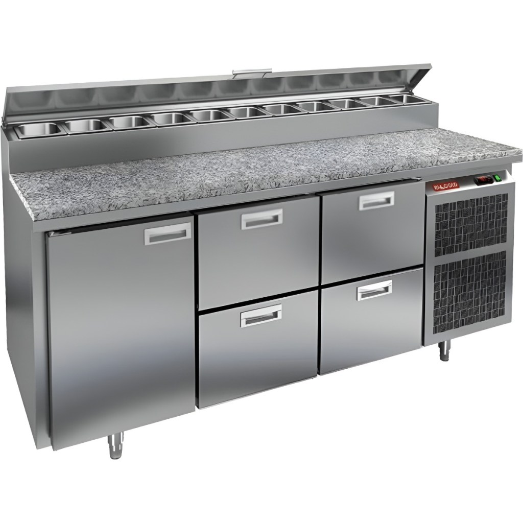 Каталог оборудования Холодильное оборудованиеСтолы охлаждаемыеСтолы холодильные для пиццыСтол холодильный для пиццы HiCold PZ2-122GN (1/6) камень Стол холодильный для пиццы HiCold PZ2-122GN (1/6) камень Код товара: 064-757 Поделиться: WhatsAppTelegram СравнитьДобавить в КПВ избранное 0 308 061 ₽ В корзину 0 шт Под заказСамовывоз сегодня бесплатно Взять в кредит Купить в лизинг Получить консультацию в Max Описание Характеристики Отзывы 0 Стол холодильный для пиццы HiCold PZ2-122GN (1/6) камень предназначен для кухонь и предприятий общественного питания. Он используется для раскатки теста, подготовки ингредиентов для пиццы, салатов и других блюд, а также для охлаждения и кратковременного хранения скоропортящихся продуктов. Модель совмещает гранитную рабочую поверхность и охлаждаемый отсек с 1 дверью и 4 ящиками, обеспечивая удобный доступ к ингредиентам и эффективное хранение. Особенности: Динамическая система охлаждения для равномерного поддержания температуры Автоматическая оттайка для удобного обслуживания Электронная панель управления для точной настройки параметров Вместительная внутренняя полка формата GN 1/1 (размер 530×325 мм) 1 дверь и 4 вместительных ящика для хранения ингредиентов Автоматические доводчики дверей с фиксатором открытого положения Легкозаменяемые магнитные уплотнители для герметичности Открытая агрегатная часть для легкого доступа к компонентам Регулируемые по высоте ножки для устойчивости Гранитная рабочая поверхность глубиной 486 мм и толщиной 50 мм — устойчива к повреждениям, высоким температурам и царапинам Толщина теплоизоляции: 50 мм Максимальная глубина гастроемкостей: 100 мм Вместимость салат-бара: 11 гастроемкости Стол холодильный HiCold PZ2-122GN (1/6) камень — это надёжный и функциональный стол для пиццы. Он сочетает рабочую поверхность и охлаждаемый отсек, облегчает хранение и подготовку ингредиентов, повышает удобство работы повара и соответствует стандартам профессиональной кухни.Изображение товара, представленного на фото, может отличаться от его фактического вида. Показать все Габаритные размеры1835×700×1000 ммДиапазон рабочей температурыот +2 до +10 °CРасположение агрегатаБоковое Материал столешницыГранитная Тип столаС дверьми и ящиками Тип двериГлухая Объём350 лТип гастроемкостейGN 1/6 Количество дверей1 штКоличество ящиков4 штРазмер полки530×325 ммНапряжение220 ВМощность0,5 кВтТип охлажденияДинамическое Тип оттайкиАвтоматическая Габариты в упаковке2000×850×1140 ммВес нетто172 кгВес брутто248 кгБрендHicoldВсе холодильные столы для пиццы Hicold Оставить отзыв Еще никто не оставил отзыв на этот товар Ранее просмотрено Под заказ 292 761 ₽ Стол холодильный для пиццы HiCold PZ2-113GN (1/6) камень В наличии Цена по запросу Витрина морозильная Иней LIDA-LOTUS М 3,75