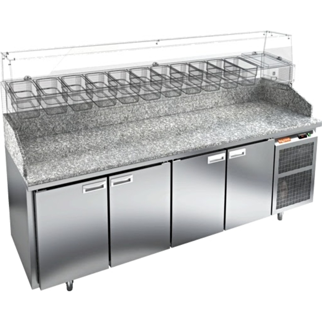 HiCold PZ3-1111/GN — надёжный и вместительный стол для пиццы с гранитной столешницей, идеально подходящий для интенсивной эксплуатации на профессиональной кухне. Поддержка витрин расширяет его функциональность.