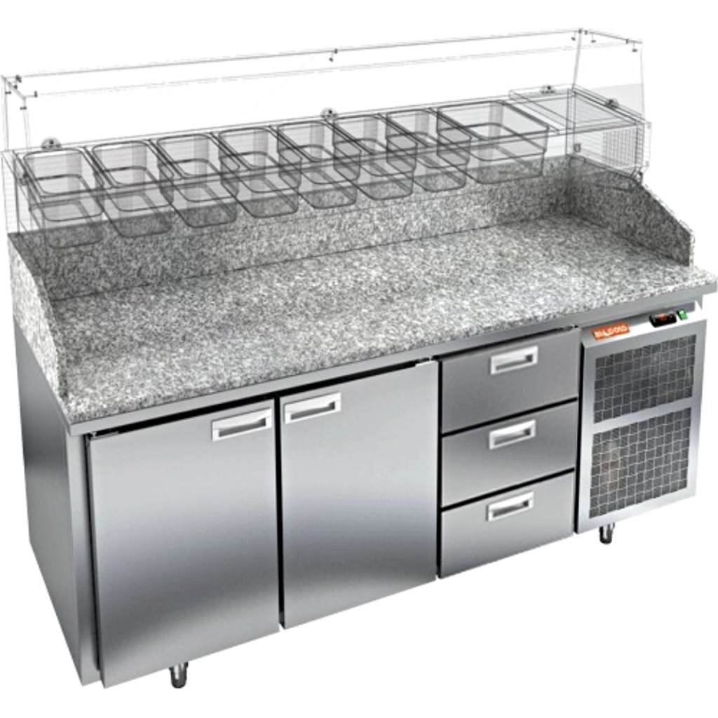 Каталог оборудования Холодильное оборудованиеСтолы охлаждаемыеСтолы холодильные для пиццыСтол холодильный для пиццы HiCold PZ3-113/GN камень Стол холодильный для пиццы HiCold PZ3-113/GN камень Код товара: 065-007 Поделиться: WhatsAppTelegram СравнитьДобавить в КПВ избранное 0 312 652 ₽ В корзину 0 шт Под заказСамовывоз сегодня бесплатно Взять в кредит Купить в лизинг Получить консультацию в WhatsApp Описание Характеристики Отзывы 0 Стол холодильный для пиццы HiCold PZE3-113/GN камень предназначен для использования в пиццериях, кафе, магазинах и ресторанах. Он идеально подходит для раскатки теста, подготовки ингредиентов и кратковременного хранения скоропортящихся продуктов. Витрина приобретается отдельно. Стол сочетает корпус из нержавеющей стали и гранитную столешницу, которая устойчива к механическим и температурным нагрузкам и удобна в работе с тестом. Такая конструкция обеспечивает долговечность, гигиеничность и простоту ухода. Особенности модели: Охлаждение: динамическое — равномерное поддержание температуры Оттайка: автоматическая — удобство и экономия времени Панель управления: электронная — точная настройка температуры Ножки: регулируемые по высоте — устойчивость на неровной поверхности Двери: 2 глухие двери с автоматическими доводчиками и фиксатором открытого положения Ящики: 3 выдвижных ящика — удобное хранение ингредиентов Уплотнители: легкозаменяемые магнитные — герметичность и простота обслуживания Толщина теплоизоляции: 50 мм — сохранение холода и энергоэффективность Рабочая поверхность: глубина 680 мм — удобство работы HiCold PZE3-113/GN камень— это надёжный и функциональный холодильный стол для пиццы, который сочетает прочность, эргономику и эффективное охлаждение. Благодаря гранитной столешнице, корпусу из нержавеющей стали, двум глухим дверям и двум выдвижным ящикам он станет универсальным решением для профессиональной кухни. Изображение товара, представленного на фото, может отличаться от его фактического вида. Показать все Габаритные размеры1835×700×1050 ммДиапазон рабочей температурыот +2 до +10 °CРасположение агрегатаБоковое Материал столешницыГранитная Тип столаС дверьми и ящиками Тип двериГлухая Объём505 лКоличество дверей2 штКоличество ящиков3 штРазмер полки530×325 ммНапряжение220 ВМощность0,5 кВтТип охлажденияДинамическое Тип оттайкиАвтоматическая Габариты в упаковке2000×850×1180 ммВес нетто172 кгВес брутто192 кгБрендHicoldВсе холодильные столы для пиццы HicoldВсе нержавеющие холодильные столы для пиццы Оставить отзыв Еще никто не оставил отзыв на этот товар Ранее просмотрено В наличии 231 561 ₽ Стол холодильный для пиццы HiCold PZE1-1111/GN стекло Под заказ 191 782 ₽ Стол холодильный для пиццы HiCold PZE2-111/GN (1/6H) З