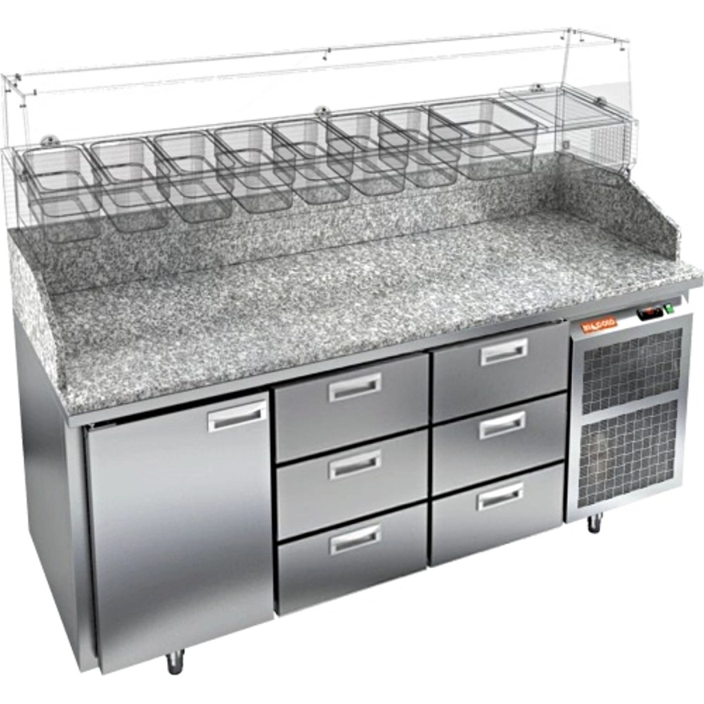 Каталог оборудования Холодильное оборудованиеСтолы охлаждаемыеСтолы холодильные для пиццыСтол холодильный для пиццы HiCold PZ3-133/GN камень Стол холодильный для пиццы HiCold PZ3-133/GN камень Код товара: 065-009 Поделиться: WhatsAppTelegram СравнитьДобавить в КПВ избранное 0 358 552 ₽ В корзину 0 шт Под заказСамовывоз сегодня бесплатно Взять в кредит Купить в лизинг Получить консультацию в WhatsApp Описание Характеристики Отзывы 0 Стол холодильный для пиццы HiCold PZE3-133/GN камень предназначен для использования в пиццериях, кафе, магазинах и ресторанах. Он идеально подходит для раскатки теста, подготовки ингредиентов и кратковременного хранения скоропортящихся продуктов. Витрина приобретается отдельно. Стол сочетает корпус из нержавеющей стали и гранитную столешницу, которая устойчива к механическим и температурным нагрузкам и удобна в работе с тестом. Такая конструкция обеспечивает долговечность, гигиеничность и простоту ухода. Особенности модели: Охлаждение: динамическое — равномерное поддержание температуры Оттайка: автоматическая — удобство и экономия времени Панель управления: электронная — точная настройка температуры Ножки: регулируемые по высоте — устойчивость на неровной поверхности Двери: 1 глухая дверца с автоматическими доводчиками и фиксатором открытого положения Ящики: 6 выдвижных ящика — удобное хранение ингредиентов Уплотнители: легкозаменяемые магнитные — герметичность и простота обслуживания Толщина теплоизоляции: 50 мм — сохранение холода и энергоэффективность Рабочая поверхность: глубина 680 мм — удобство работы HiCold PZE3-133/GN камень— это надёжный и функциональный холодильный стол для пиццы, который сочетает прочность, эргономику и эффективное охлаждение. Благодаря гранитной столешнице, корпусу из нержавеющей стали, двум глухим дверям и двум выдвижным ящикам он станет универсальным решением для профессиональной кухни. Изображение товара, представленного на фото, может отличаться от его фактического вида. Показать все Габаритные размеры1835×700×1050 ммДиапазон рабочей температурыот +2 до +10 °CРасположение агрегатаБоковое Материал столешницыГранитная Тип столаС дверьми и ящиками Тип двериГлухая Объём505 лКоличество дверей2 штКоличество ящиков2 штРазмер полки530×325 ммНапряжение220 ВМощность0,5 кВтТип охлажденияДинамическое Тип оттайкиАвтоматическая Габариты в упаковке2000×850×1180 ммВес нетто172 кгВес брутто192 кгБрендHicoldВсе холодильные столы для пиццы HicoldВсе нержавеющие холодильные столы для пиццы Оставить отзыв Еще никто не оставил отзыв на этот товар Ранее просмотрено Под заказ 225 711 ₽ Стол холодильный для пиццы HiCold PZ1-111GN (1/3) стекло Под заказ 373 852 ₽ Стол холодильный для пиццы HiCold PZ3-223/GN камень