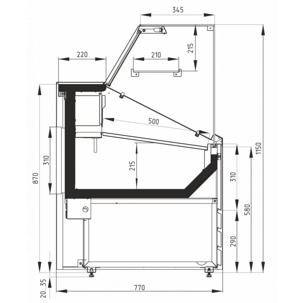 Конструкция витрины включает накопитель для продуктов, поддон для выкладки и регулируемые ножки высотой 20–35 мм. Столешница, зона выкладки, боковые и нижняя фронтальная панели, а также обшивка светильника и испарителя выполнены из стали серебристого цвета. Декоративная передняя панель — из стали, держатель стекла — из нержавеющей стали. Боковины и столешница имеют пенополиуретановую теплоизоляцию.