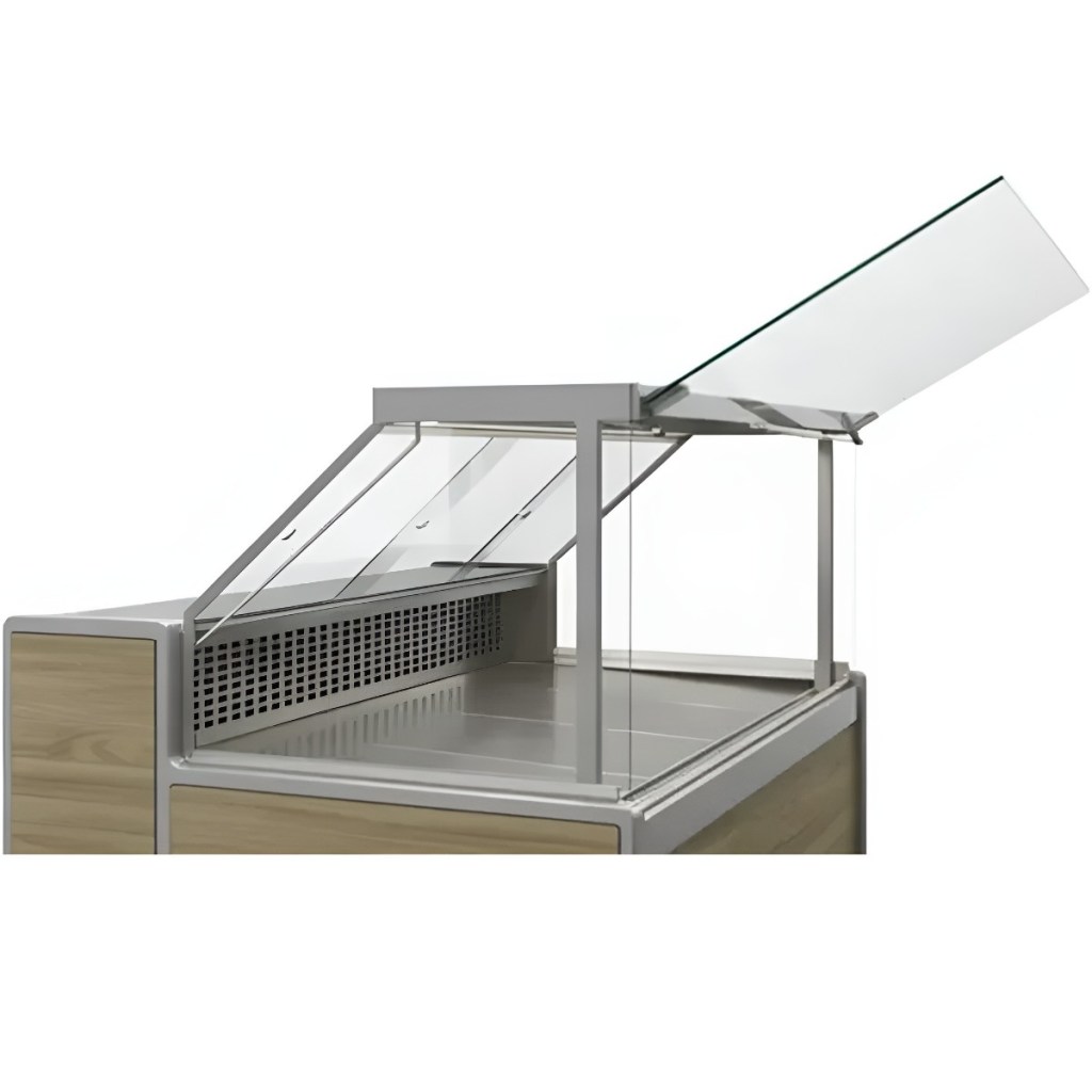 • Подъёмное фронтальное стекло с газлифтом — удобный доступ к продуктам и лёгкое обслуживание.